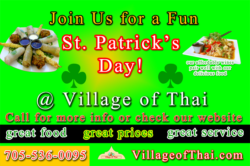 Family Thai and South Asian Restaurant serving Peterborough and Kawartha Lakes area. Great food, affordable prices. Call 705-536-0095 Thai hot and sour shrimp soup. SALADS. NOODLES. CHICKEN / BEEF / SHRIMP / VEGETARIAN and more. Catering. Weddings. Office Parties. Takeout Food. Delivery Try Our Delicious Thai & South Asian Cuisine. CUISINE LUNCH DINNER LOCATION REVIEWS GALLERY Celebrate St. Patrick's Day with us - Mar. 17th